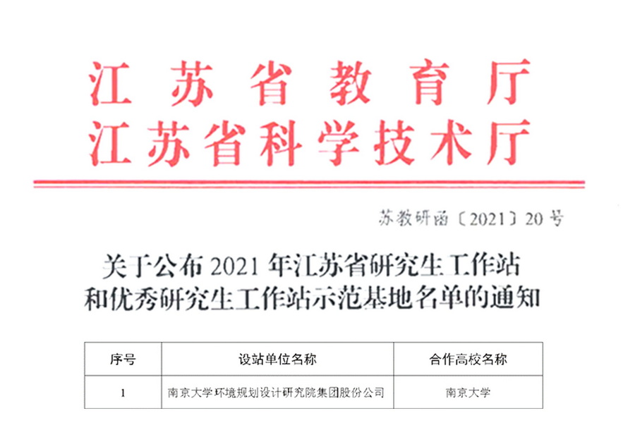 近日,江蘇省教育廳、科技廳聯(lián)合發(fā)布《關(guān)于公布2021年江蘇省研究生工作站和優(yōu)秀研究生工作站示范基地名單的通知》,南大環(huán)規(guī)院集團與南京大學(xué)聯(lián)合建設(shè)的工作站獲批優(yōu)秀研究生工作站示范基地(全省僅三家),也是2021年度南京大學(xué)唯一獲批的工作站示范基地。