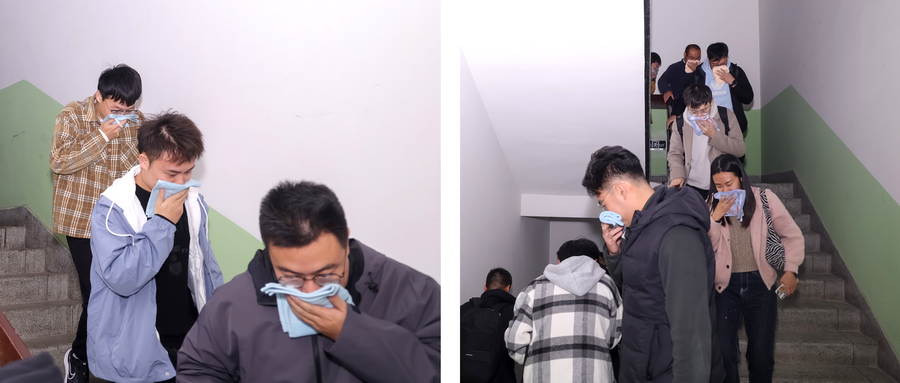 在疏散演習培訓中,隨著消防警報和發煙裝置的開啟,員工們迅速彎腰掩口鼻,服從指揮,有序地疏散至安全區域。