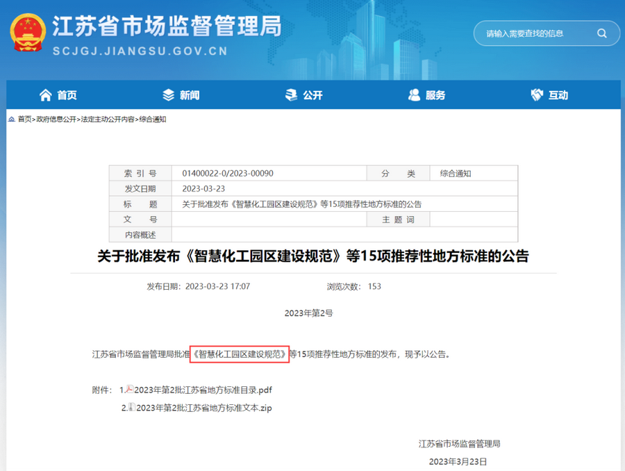 2023年3月23日,江蘇省市場監督管理局發布地方標準公告,正式批準由南大環規院參編的智慧化工園區領域標準——《智慧化工園區建設規范》(DB32/T 4454-2023),并將于2023年4月23日正式頒布實施。