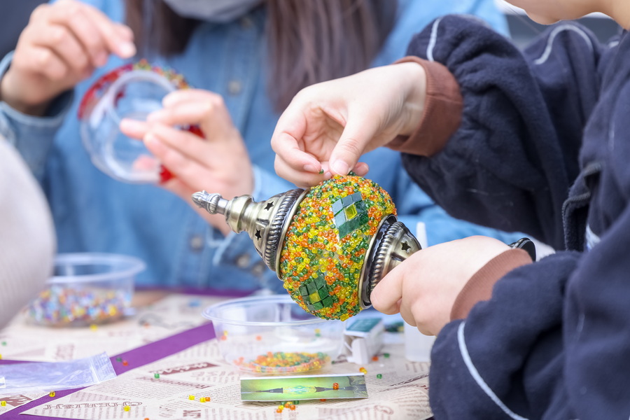 DIY環(huán)節(jié)將現(xiàn)場(chǎng)氛圍推向高潮。琳瑯滿目、形狀各異的材料盡在眼前,大家細(xì)心挑選圖案和顏色,親自動(dòng)手制作了獨(dú)一無二的土耳其琉璃燈。